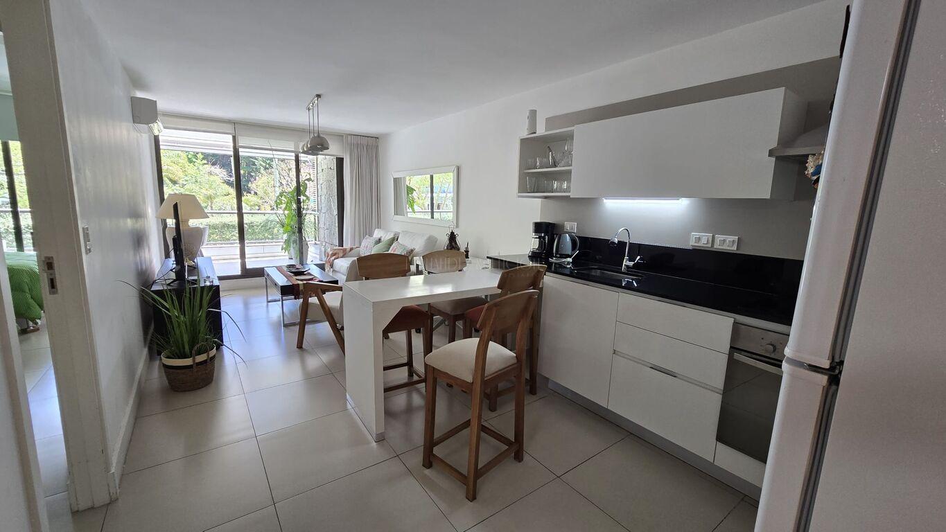 Apartamento en zona residencial 2 dormitorios 2 baños living comedor con cocina integrada totalmente equipado, terraza con parrillero, garaje muy amplio en subsuelo. El edificio cuenta con todos los servicios piscinas interior y exterior, parrilleros parque gimnasio .Consulte sin compromiso